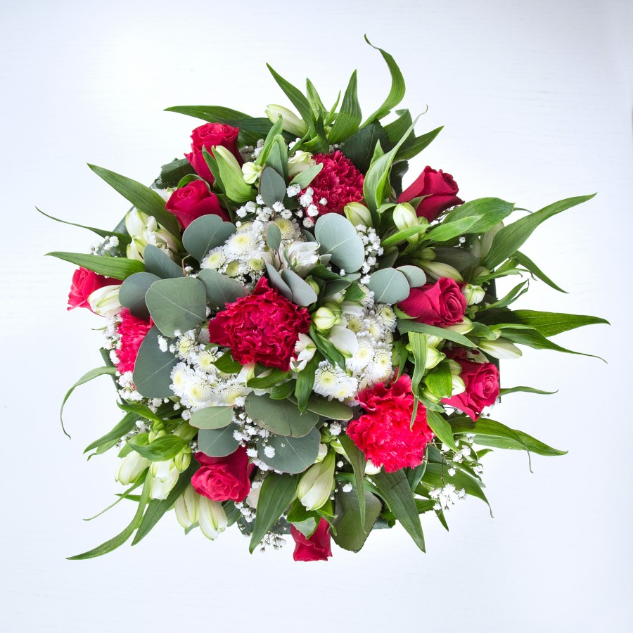 Celebrate special moments with our unique bouquet, designed to captivate and inspire. This arrangement showcases pure white chrysanthemums, lush gypsophila, and striking red roses, artfully combined with vibrant carnations.